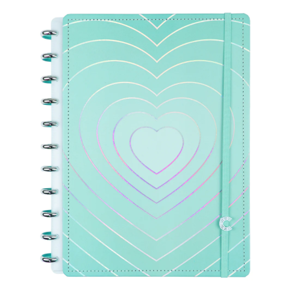 Apaixone-se e inspire-se com este caderno incrivelmente personalizável turquesa com um brilho super sofisticado em formato de coração com hotstamping holográfico.