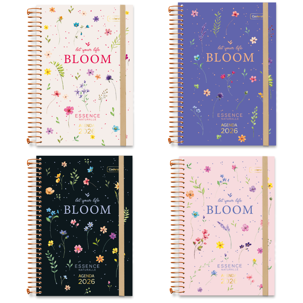 Bolsa portfólio, cartela de adesivos, metas anuais, planejamento anual, planejamento mensal, diário com 1 dia por página e espiral dourado.