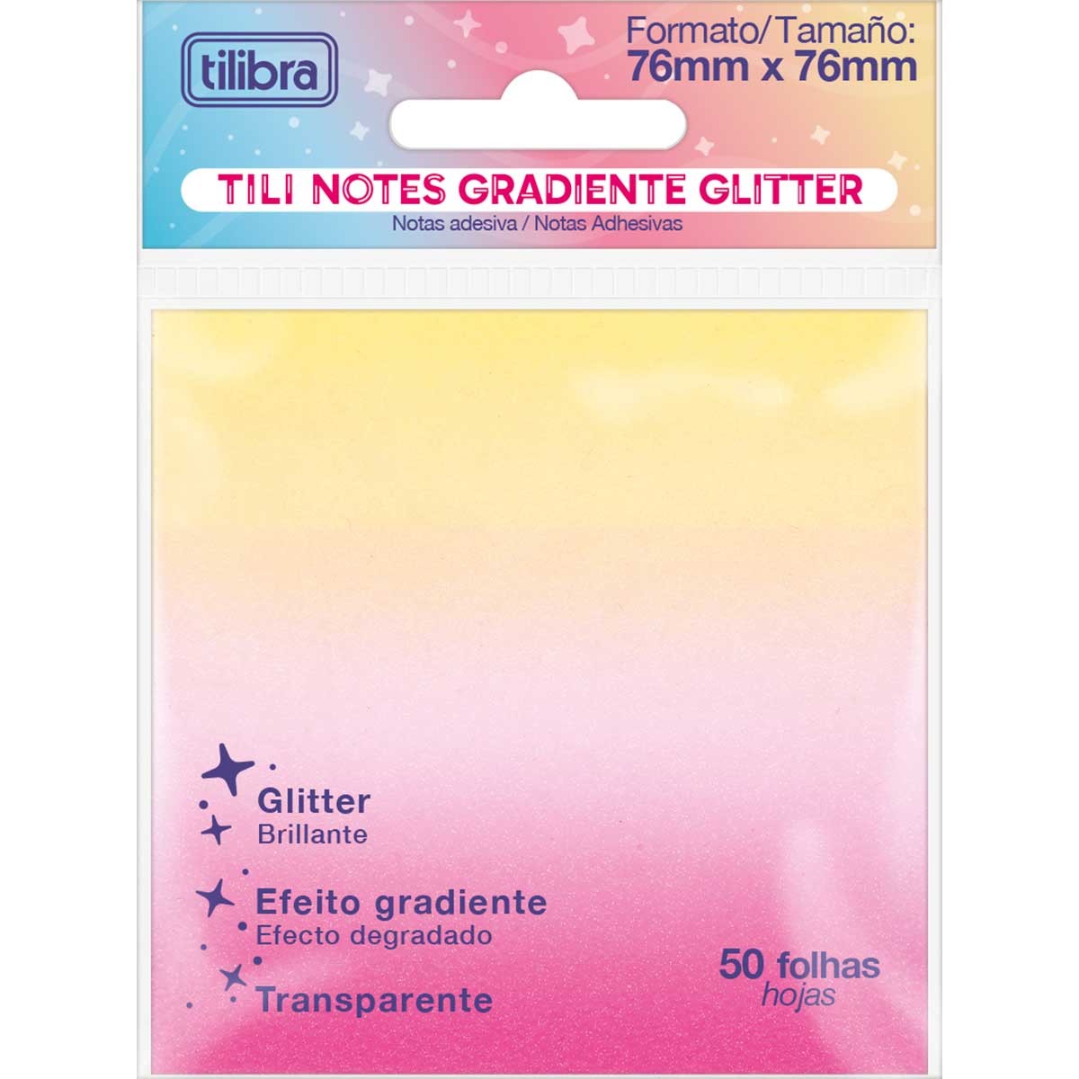 O Bloco Adesivo Tili Notes Glitter 76x76mm 50 folhas da Tilibra é um produto desenvolvido para ajudar você a anotar todas suas ideias. Este modelo é feito em material plástico transparente, nas cores rosa e amarela, com efeitos brilhante e gradiente. O Bloco Adesivo Tili Notes é reposicionável, permitindo que você cole e descole de onde quiser. Leve já o seu!