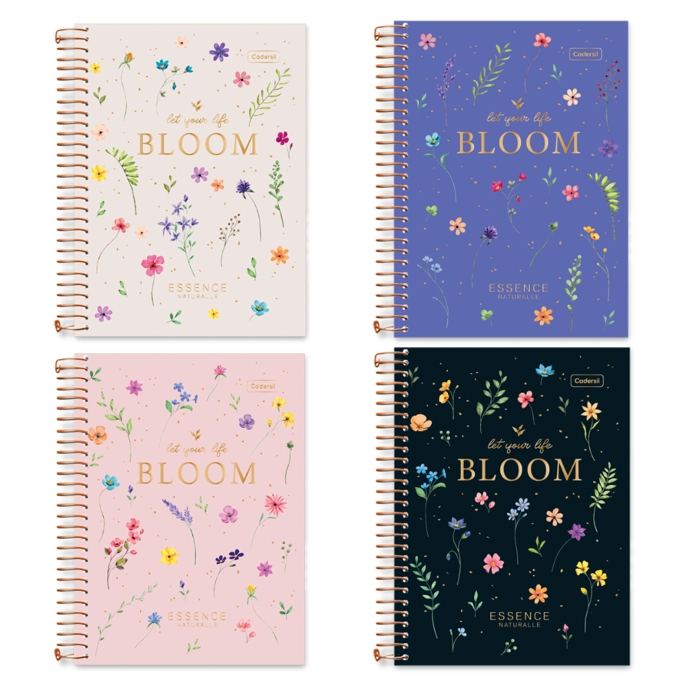 Bolsa pocket, cartela de adesivos, editorial, divisórias de matérias, miolo com microsserrilhas e espiral dourado.