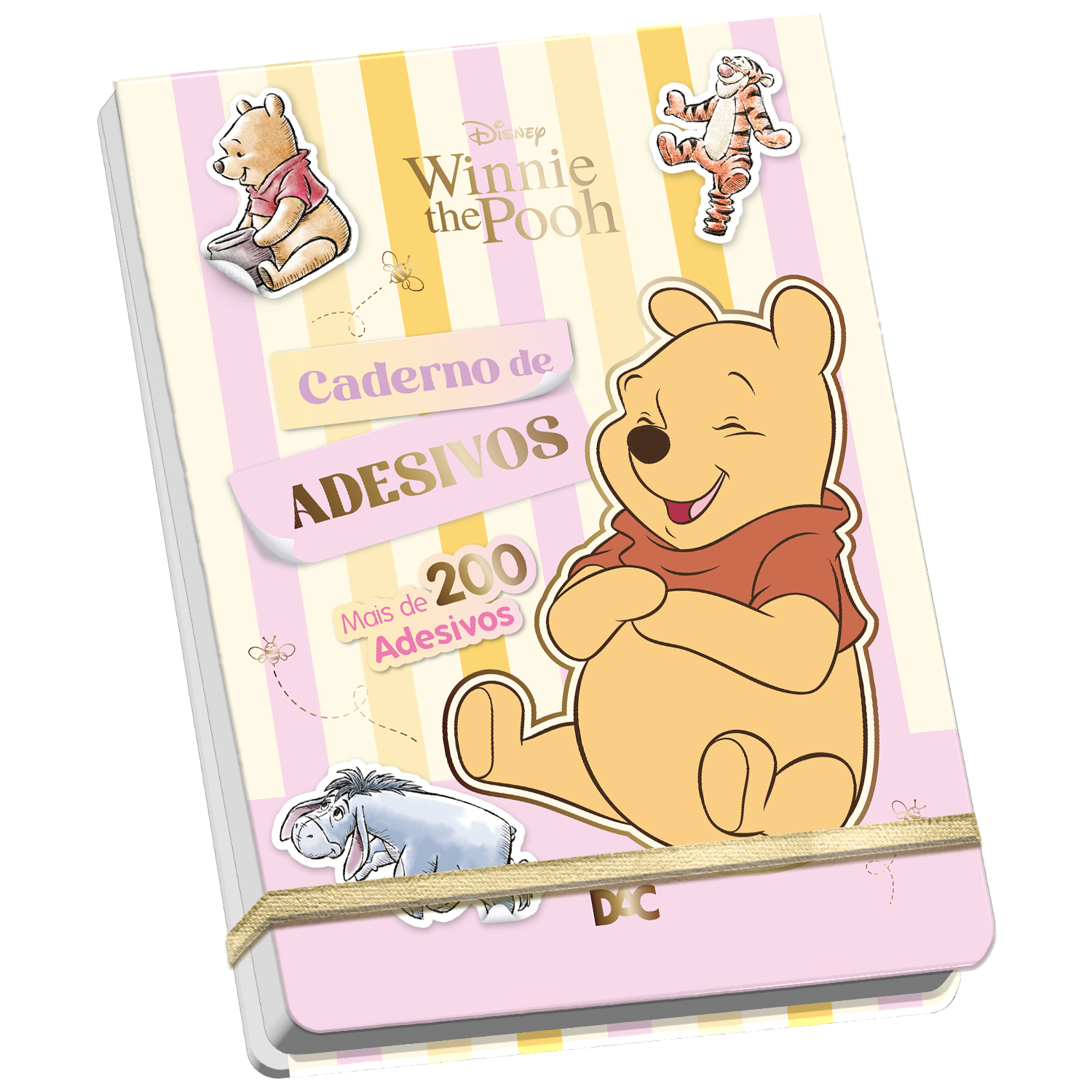 Caderno do Pooh com 200 adesivos destacáveis de personagens clássicos, capa com brilho e textura, ideal para personalizar e decorar com charme e magia.