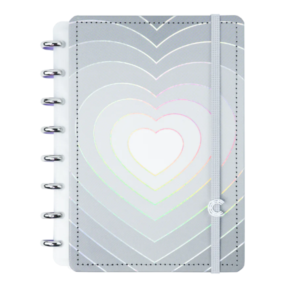 Apaixone-se e inspire-se com este caderno incrivelmente personalizável cinza com um brilho super sofisticado em formato de coração com hotstamping holográfico.
