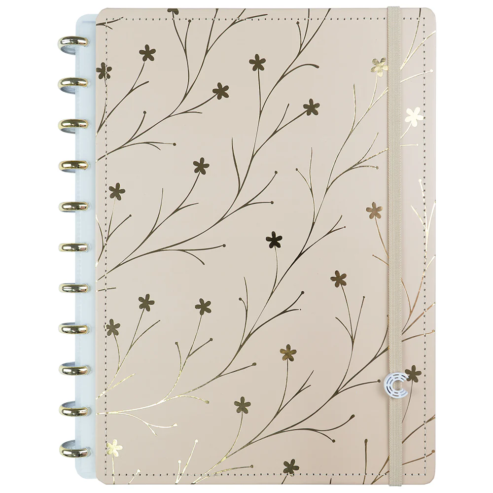 🌸 O novo modelo Miss Floral traz um design sofisticado em tons neutros, com detalhes dourado em hotstamping e estampas florais minimalistas que deixam qualquer momento de escrita ainda mais especial.