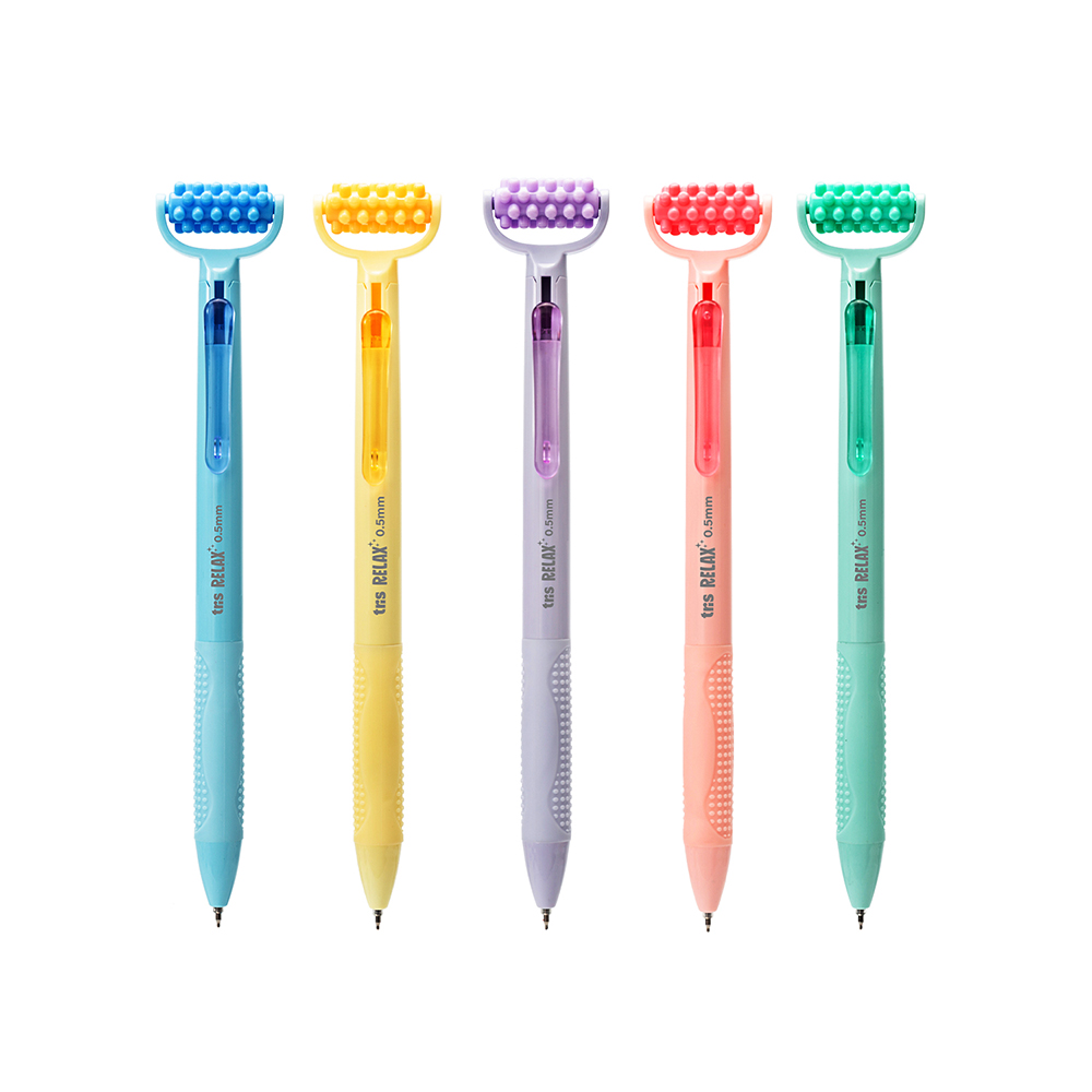 Caneta gel Relax com tinta azul, equipada com um pequeno rolinho de massagem na ponta para momentos de descanso enquanto você escreve. Combina conforto e praticidade para tornar suas anotações mais relaxantes.