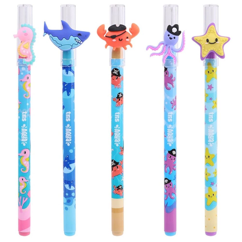A caneta esferográfica Tris Aqua possui toppers temáticos, inspirados no fundo do mar! Sua ponta é média, 1.0mm e seu corpo é estampado. Tinta azul!