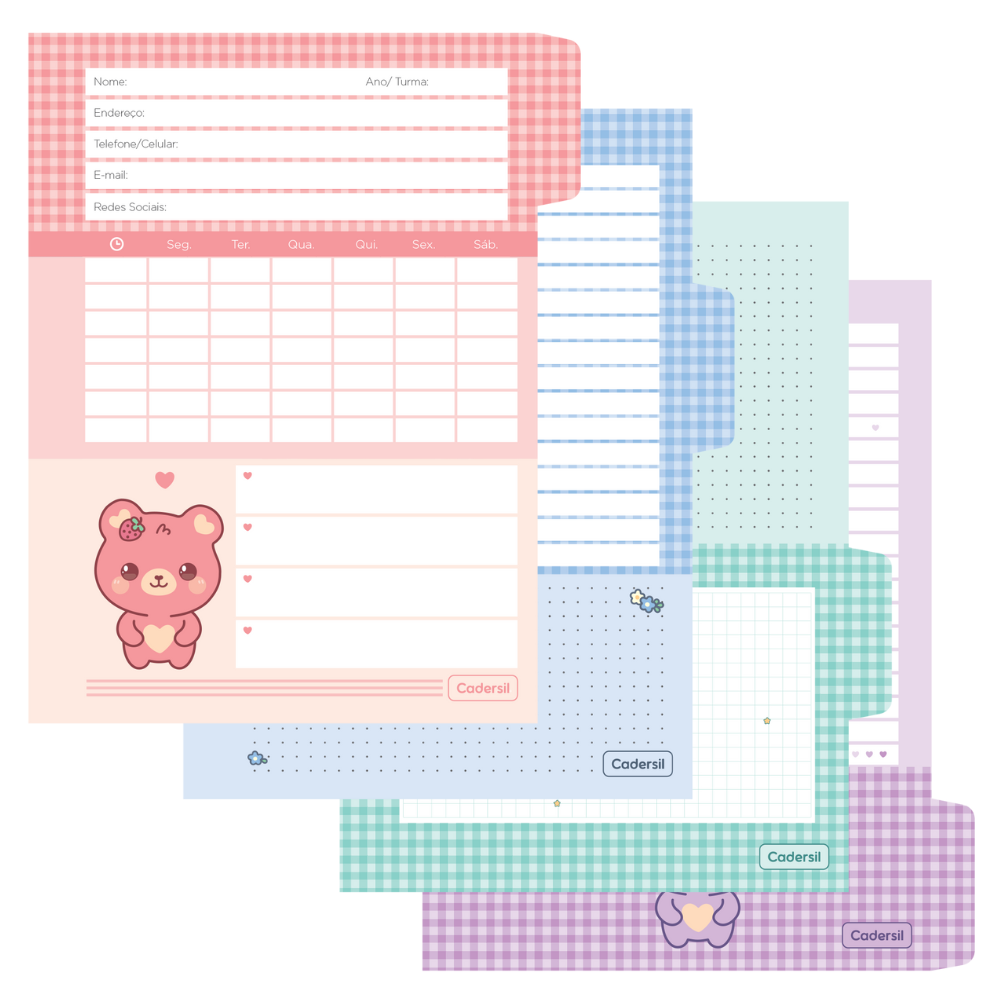 Contém 4 divisórias decoradas para caderno argolado tamanho colegial (18x24cm)
