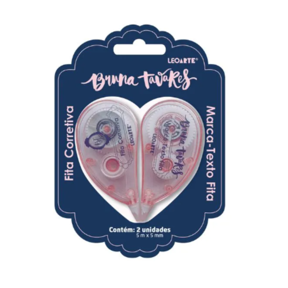 Juntos, os 2 produtos Fita Corretiva + Marca-Texto Fita Bruna Tavares formam um coração quando posicionados no blister, ficando muito delicado e atrativo visualmente.