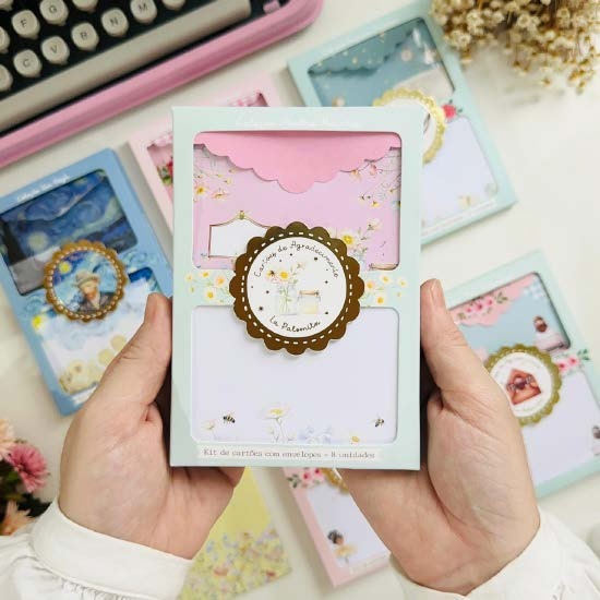 Cada caixinha contém 8 kits com envelope e cartão (9×7 cm), além de adesivos que deixam tudo ainda mais especial!