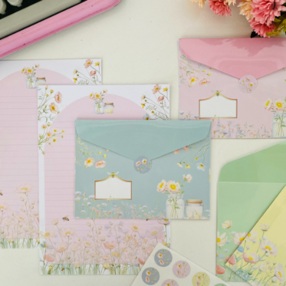 Cada kit contém 4 envelopes, 4 papéis de carta e 4 adesivos para fechamento.