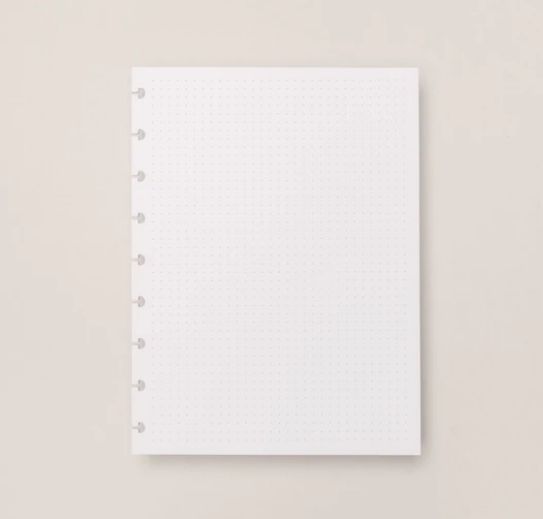 Mais uma das muitas opções de refil são as folhas pontilhadas. Elas servem para você construir seus conteúdos com muita liberdade, mas com uma base de pontinhos para guiá-lo. Ou seja: elas podem servir de estrutura para linhas, quadrados com lembretes, bullet journals e mais. O refil vem com 20 folhas 120g.